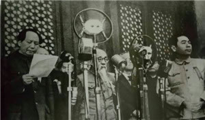 9月21日,中国人民政治协商会议第一届全体会议在北平隆重开幕。毛泽东在开幕词中庄严地宣告:“占人类总数四分之一的中国人从此站立起来了。” 这次政协会议通过了《中国人民政治协商会议共同纲领》。其中规定:“中华人民共和国为新民主主义即人民民主主义的国家,实行工人阶级领导的、以工农联盟为基础的、团结各民主阶级和国内各民族的人民民主专政”。